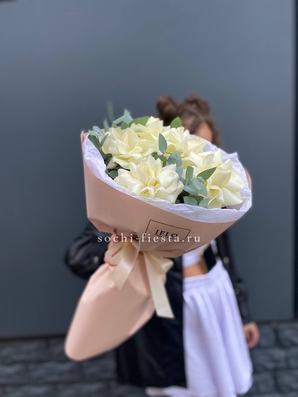 Семь белых бутонов в лаконичной обёртке. Компактная форма и чистота линий делают букет удобным для любого интерьера.