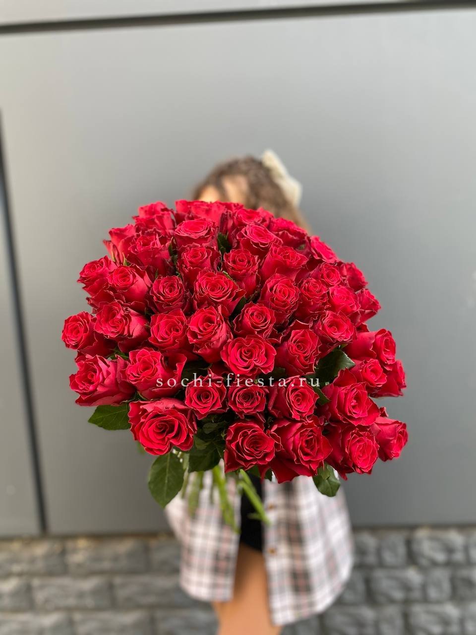 Красный оттенок лепестков переходит от алого к винному в глубине бутонов. Семь роз с эвкалиптом собраны плотно, создавая яркое цветовое пятно.