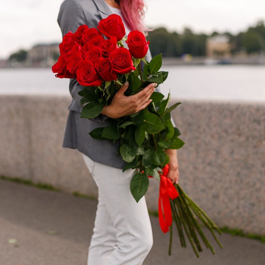 Compliment — это двадцать пять красных роз на длинных стеблях, собранных в классическую форму. Букет держит форму несколько дней и остаётся аккуратным даже в высокой вазе.
