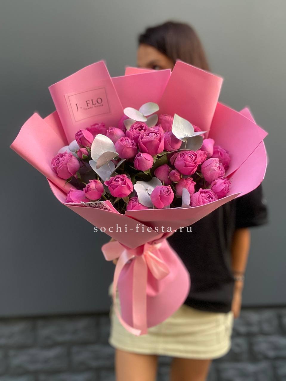 кустовая роза - 19 шт., эвкалипт, лента, дизайнерская упаковка.
