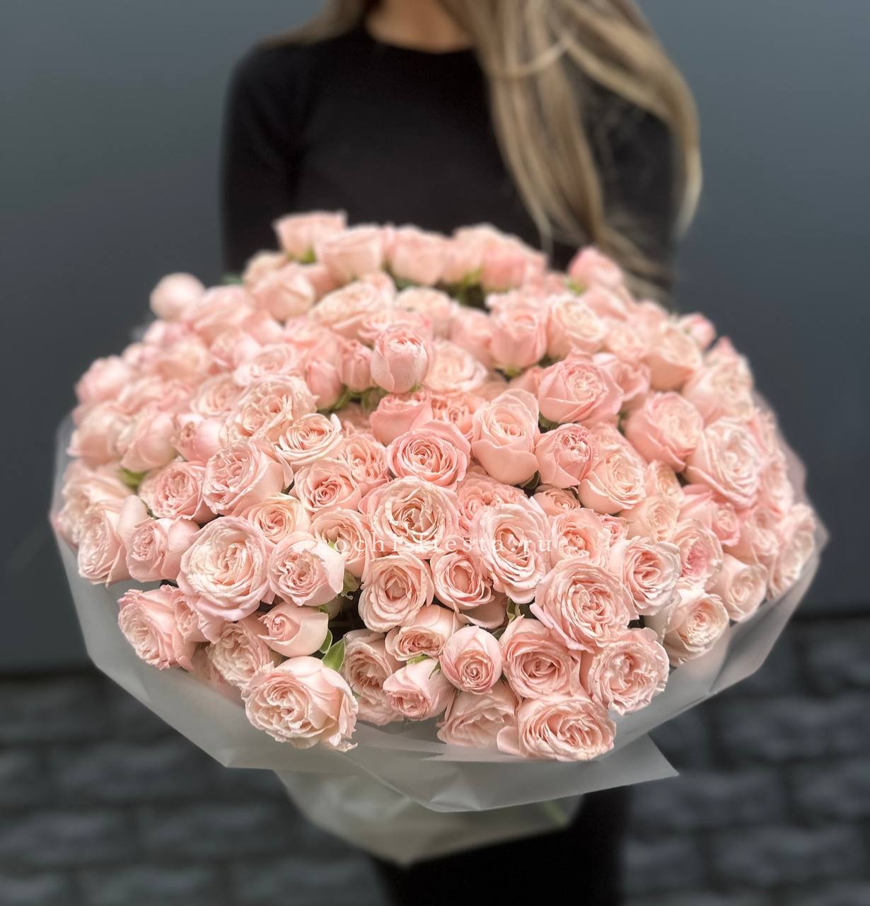 Девять кустовых роз собраны в компактную форму с мягким розовым оттенком. Множество небольших бутонов создают объемную текстуру и природную легкость. Букет упакован в матовую бумагу с лентой.