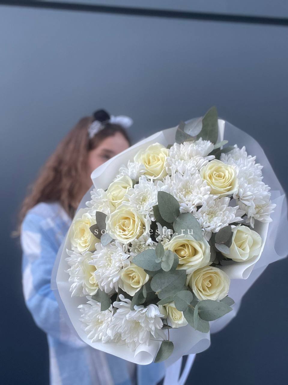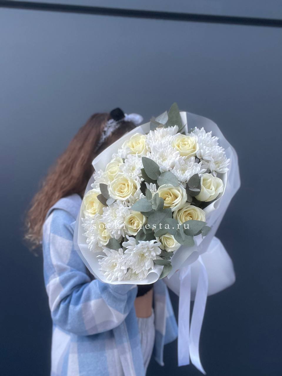 Пастельная гамма с переходами от белого к сливочному создаёт почти акварельный эффект. Гортензия и эустома образуют воздушную текстуру, а кустовая роза добавляет графичности. Букет напоминает летнее утро в саду.