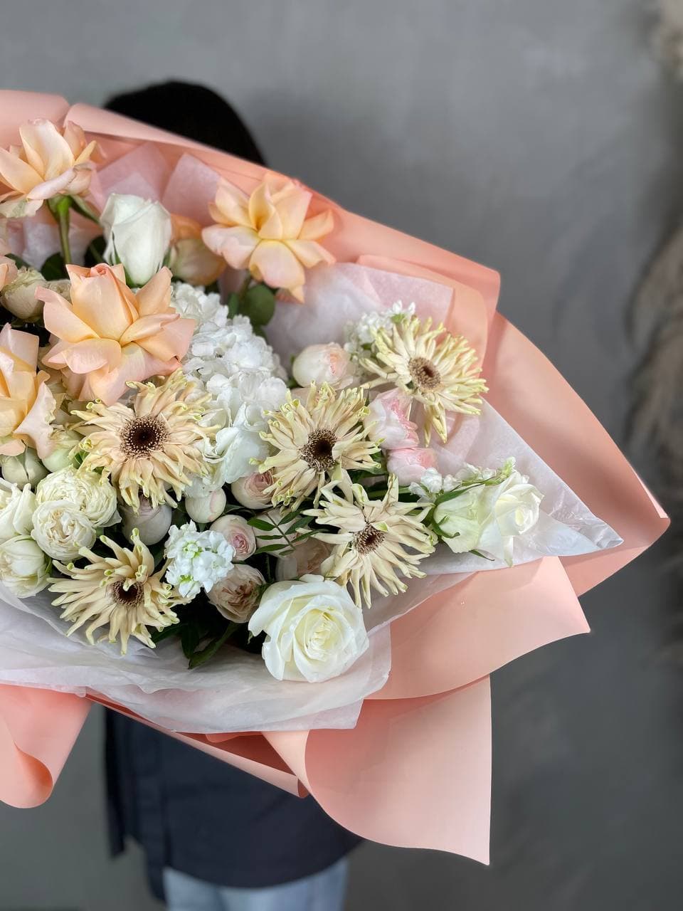 Закрученные лепестки гербер создают динамику, которую поддерживают пышные головки гортензии и многослойные кустовые розы. Дельфиниум вытягивает композицию вверх, задавая вертикальный ритм.