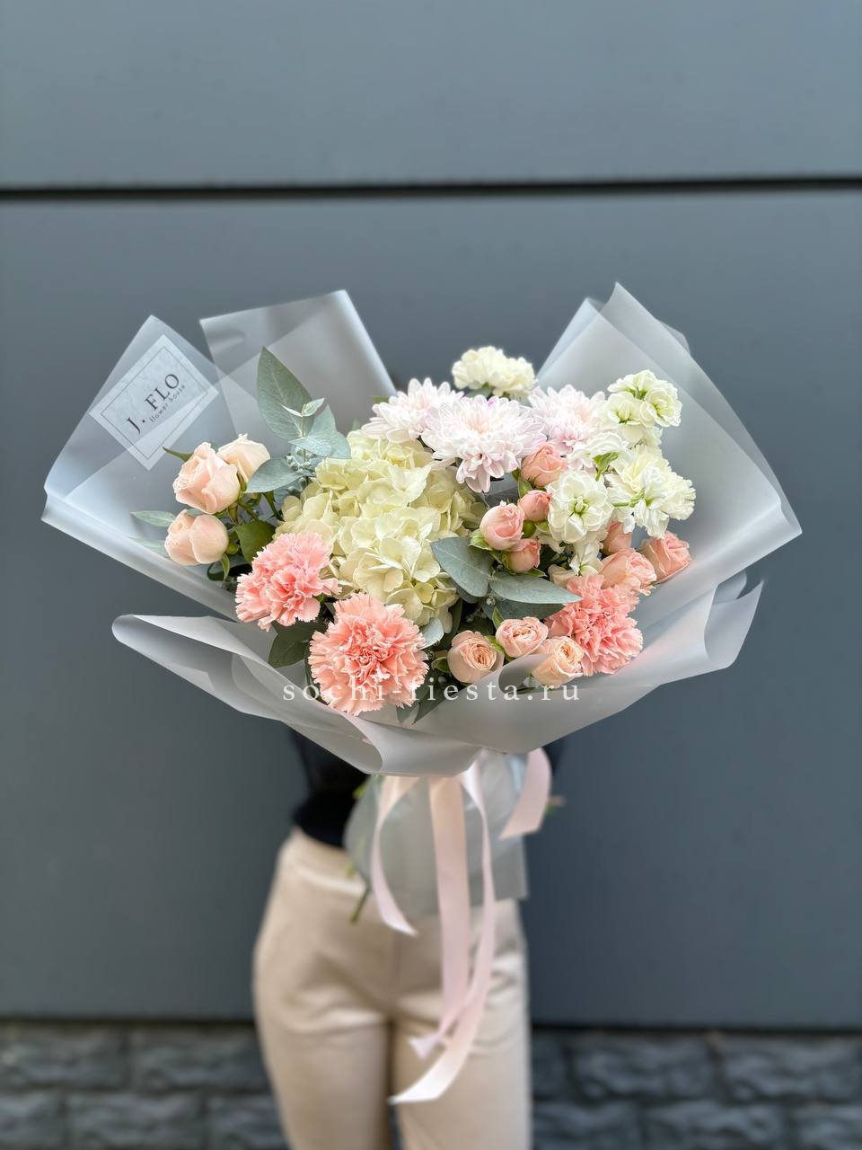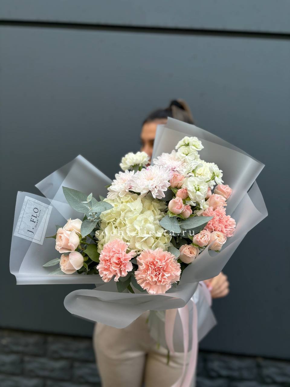 гортензия белая голландская, пионовидная роза Мисти Бабблс, оформление.