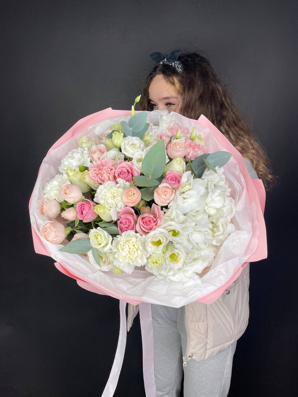 диантус, эустома, эвкалипт,  лента, дизайнерская пленка.