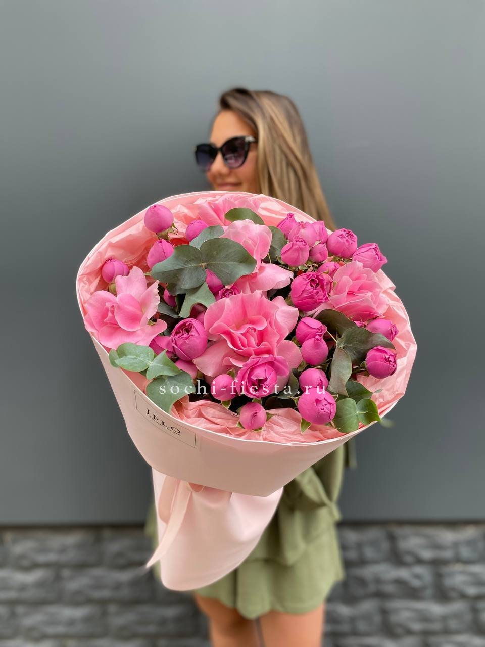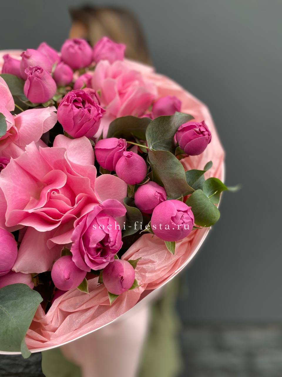 Розовые розы, пионовидная кустовая роза, эвкалипт,  лента, авторская упаковка.