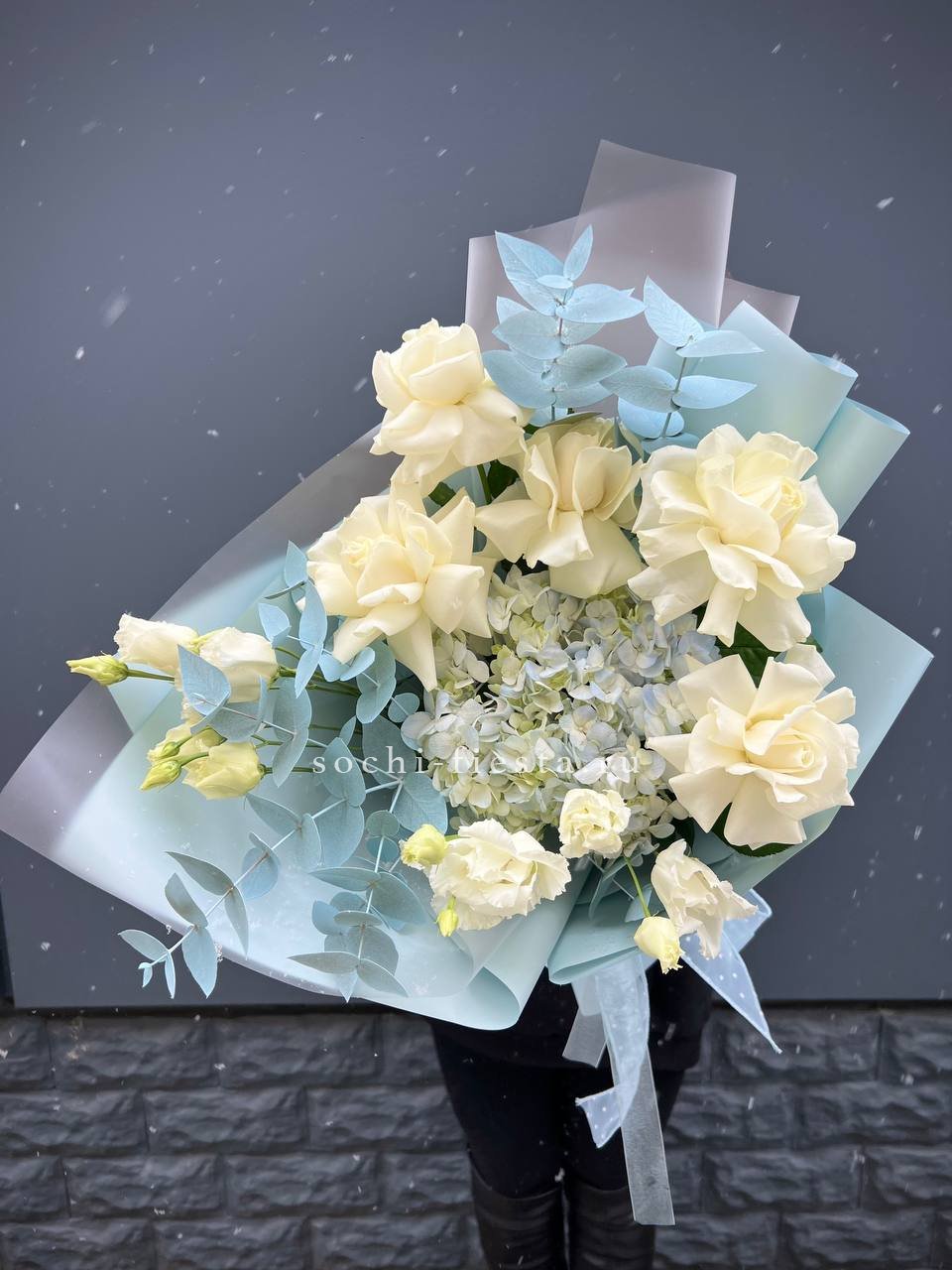 вывернутые розы, эустома, эвкалипт, лента, упаковка.