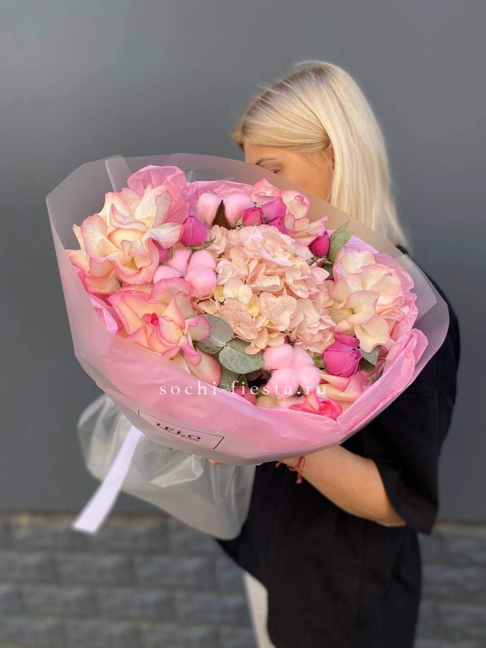 гортензия, роза белая, диантус лента, дизайнерская пленка.