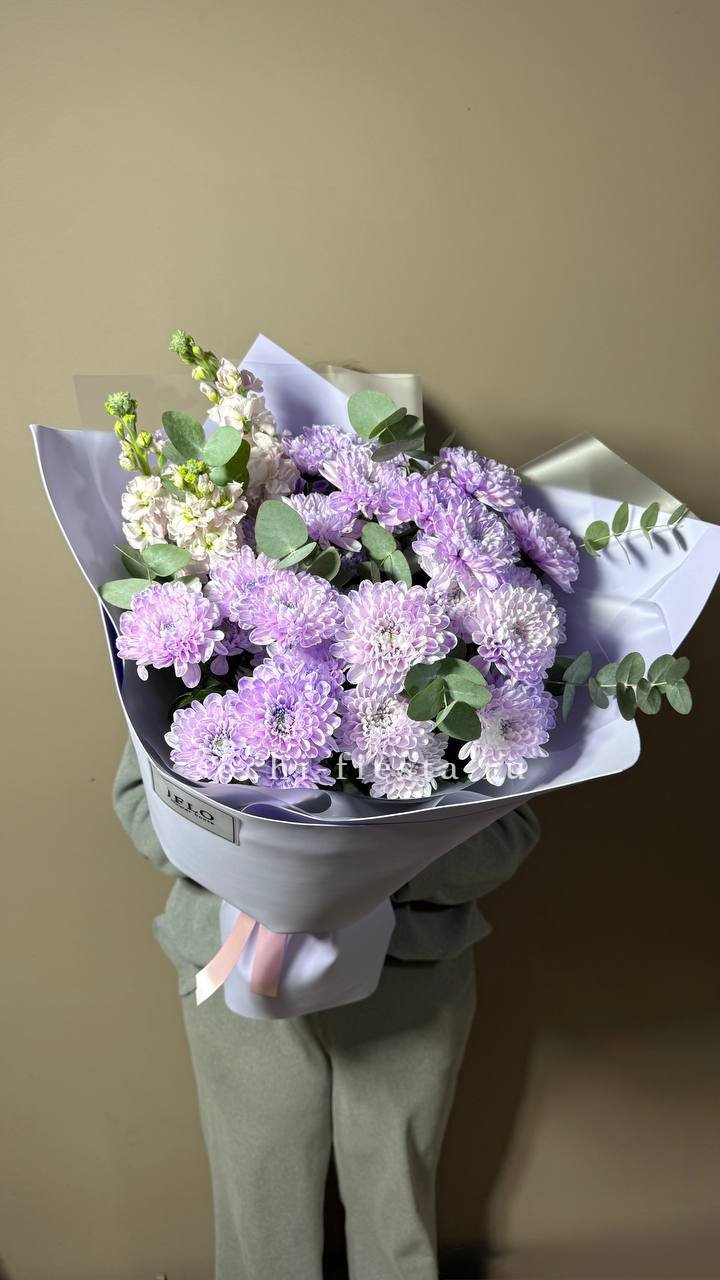 хризантема, кустовые розы, альстромерия, авторское оформление,  лента Возможна замена сезонных цветов.