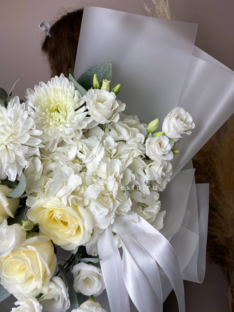 гортензия, хризантема, роза, эустома, упаковка, лента.