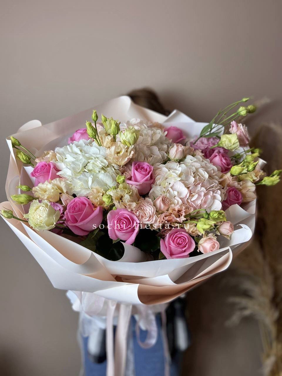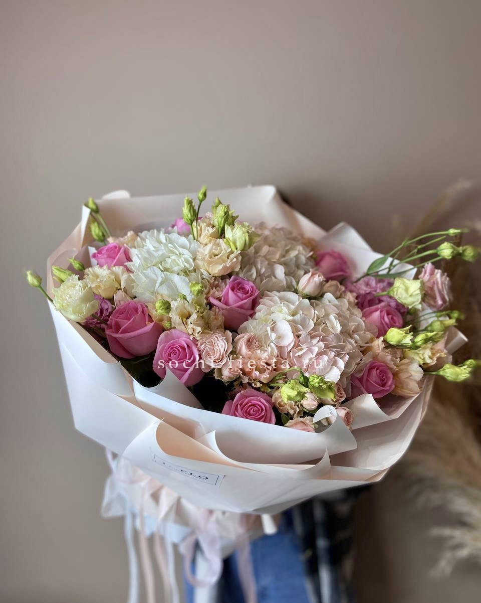 гортензия, диантус, хризантема, эустома, розы, озатамус, пленка.