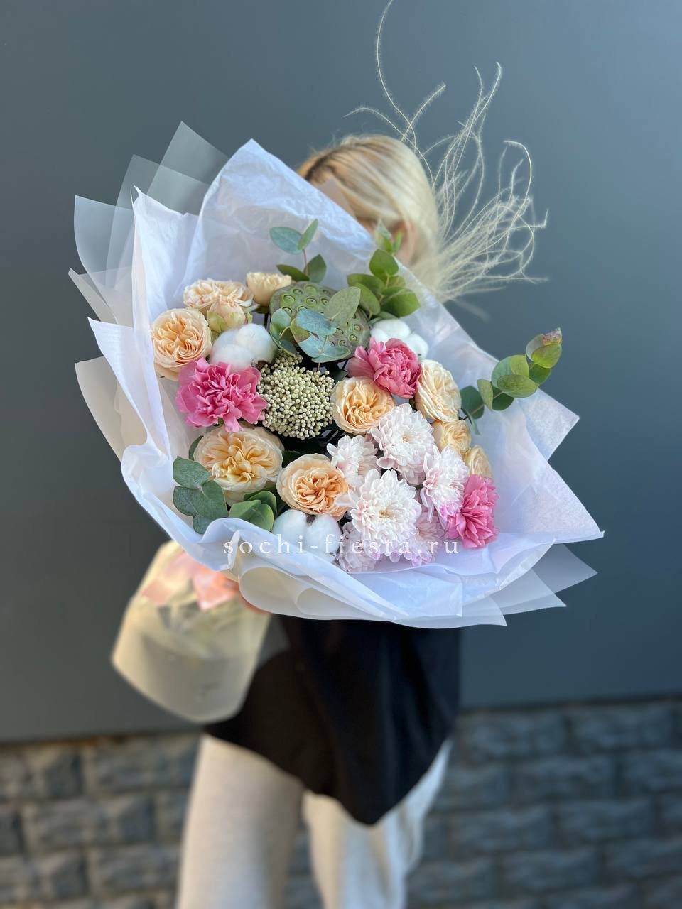 лотос, хризантема, диантус, хлопок, озатамус, пионовидная кустовая роза, эвкалипт, ковыль, оформление.