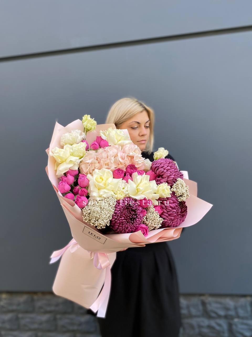 бигуди, гортензия, мисти баблс, розы, эустома, озотамус в нежном оформлении.