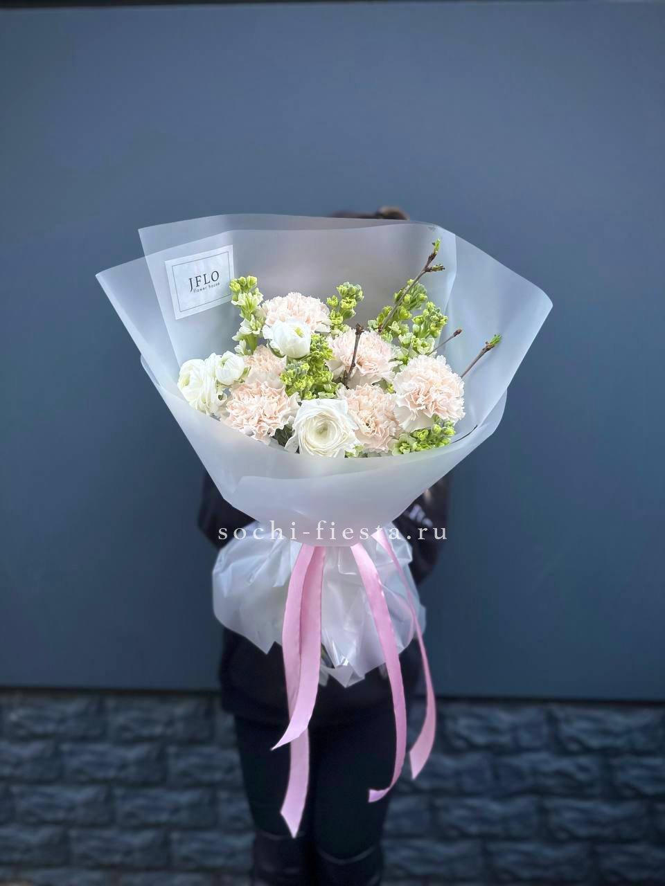 маттиола, ранункулюсы, ветки цветущие (аналог), диантусы в матовом оформлении.