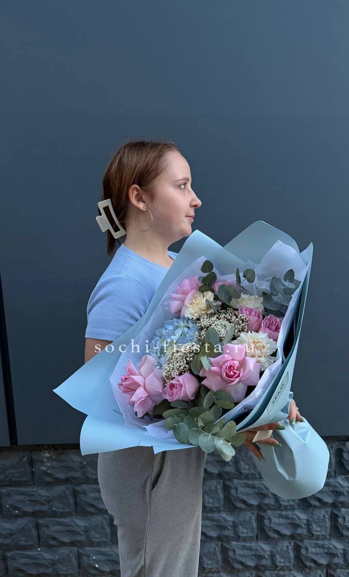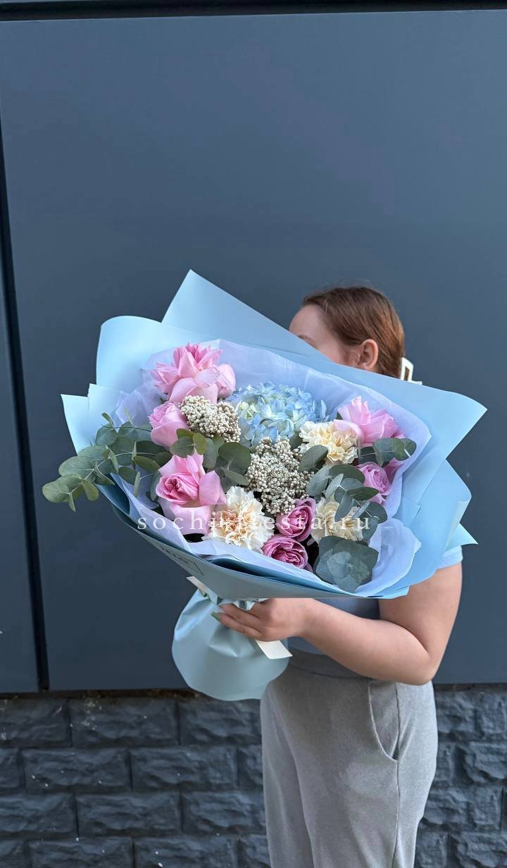 Белоснежные розы и пышные шапки гортензии сплетаются в плотную композицию, где эвкалипт задаёт спокойный ритм. Букет хорошо держит форму и долго сохраняет свежесть в вазе.