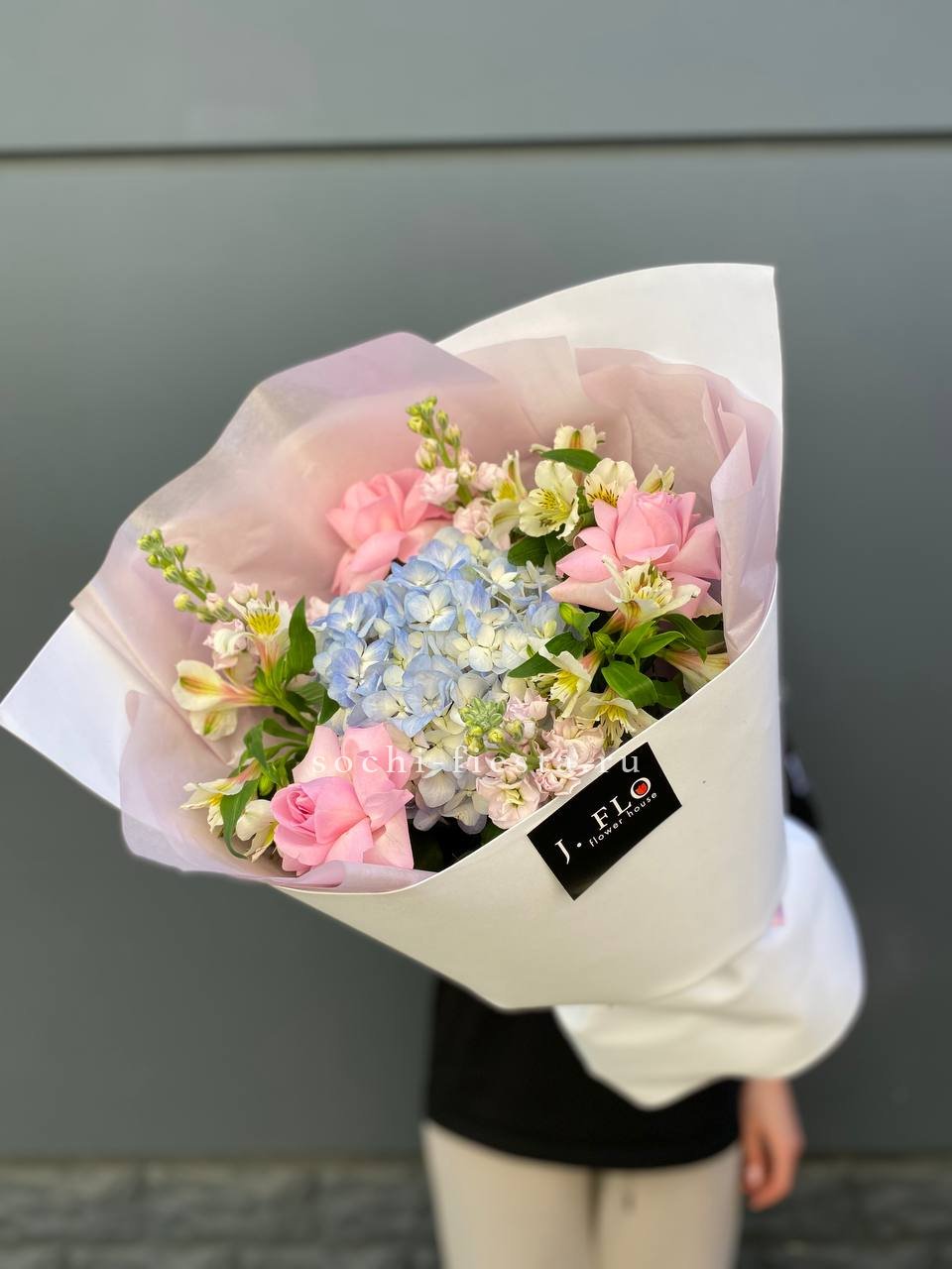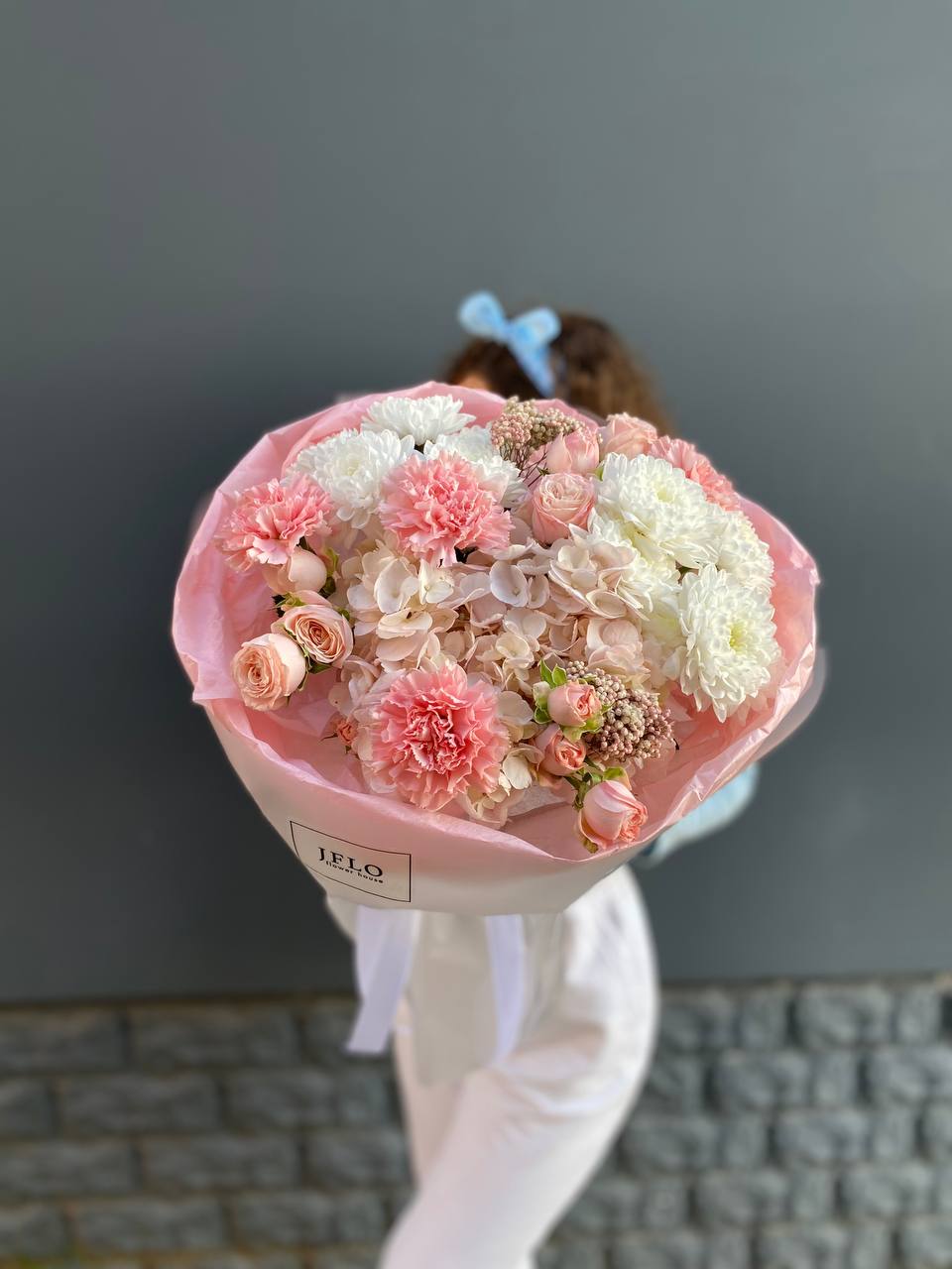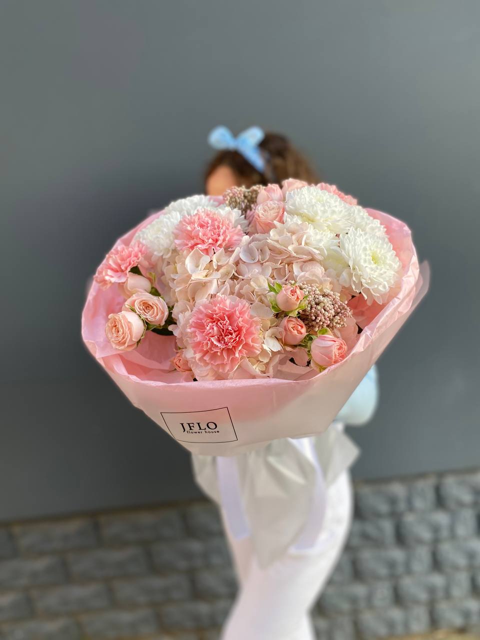 Воздушная композиция в пастельных тонах с пионовидными розами и гортензией создает объемную форму. Каждый бутон раскрывается слоями, а диантусы добавляют графичные точки среди крупных соцветий.