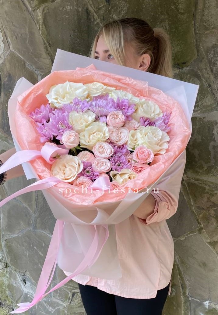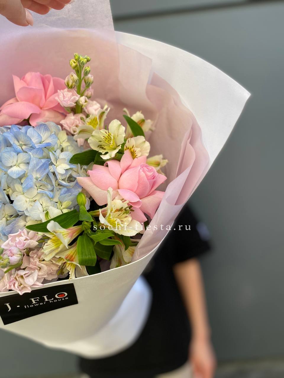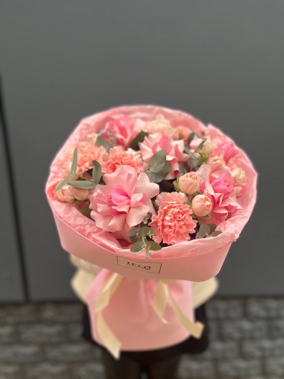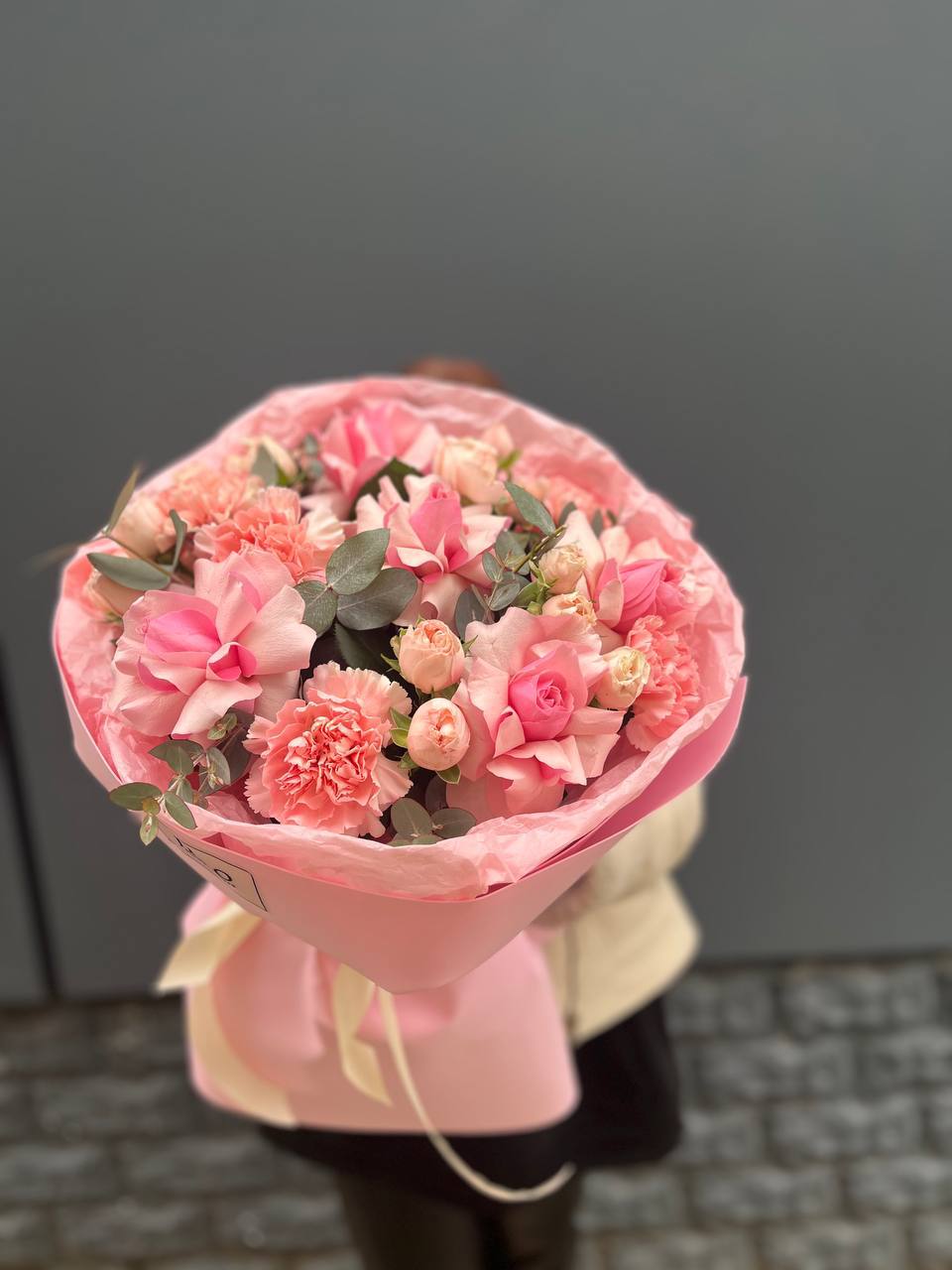 Воздушная композиция в пастельных тонах с пионовидными розами и гортензией создает объемную форму. Каждый бутон раскрывается слоями, а диантусы добавляют графичные точки среди крупных соцветий.