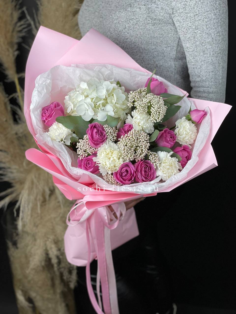 хризантемы кустовые, пионовидные розы, одноголовые розы, лента, дизайнерская упаковка.