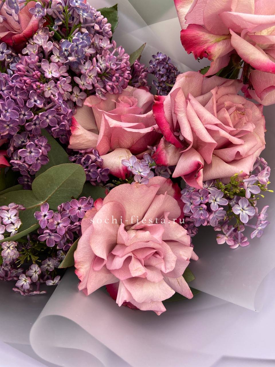 Розовые розы соседствуют с душистыми гроздьями сирени, создавая весеннее настроение даже в будний день. Эвкалипт добавляет свежести и завершает композицию спокойным зеленым фоном.