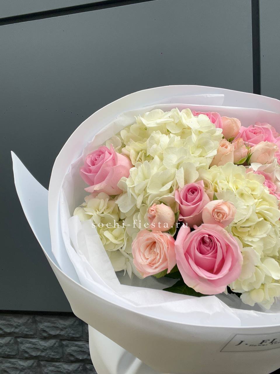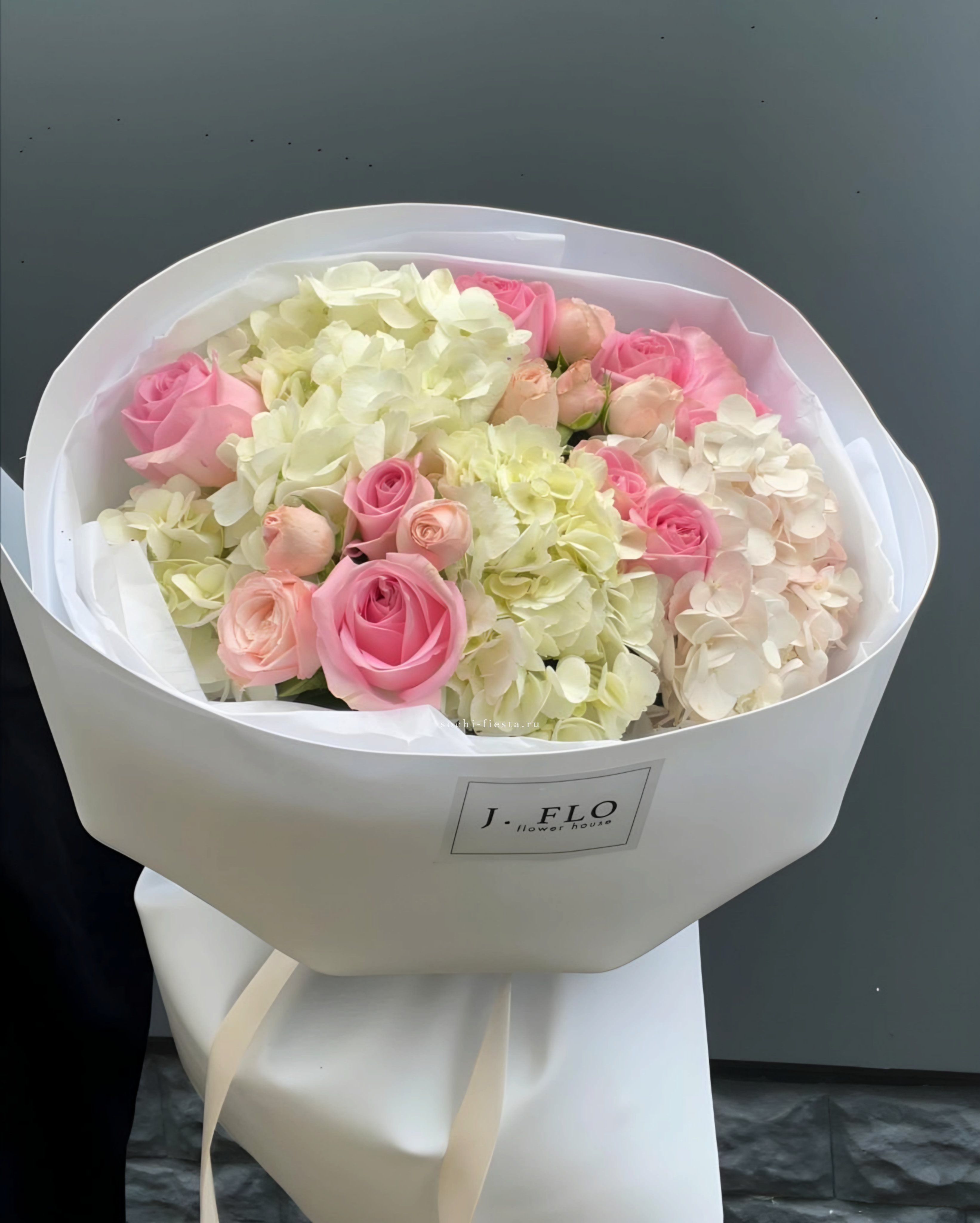 Яркая композиция собрана из гербер, роз Джумилия и воздушной гортензии. Диантус и озотамнус добавляют фактурности, создавая объёмный силуэт с живописной глубиной.