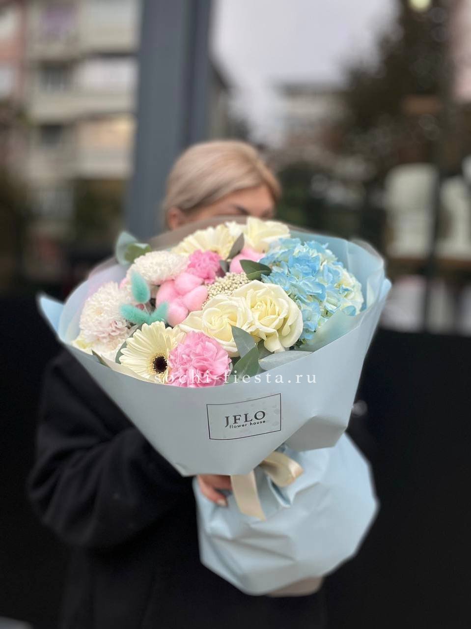 Яркие герберы встречаются с розами и хризантемами в плотной композиции. Гортензия добавляет объём, а хлопок создаёт мягкую текстурную волну по краю букета.