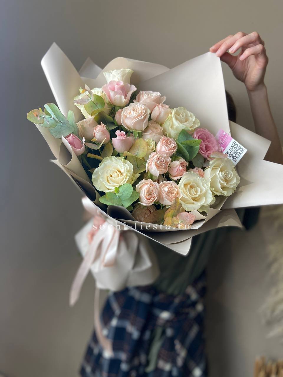 роза одноголовая, кустовая роза, альстромерия, гортензия, эустома, эвкалипт, декоративная зелень, лента, крафт.