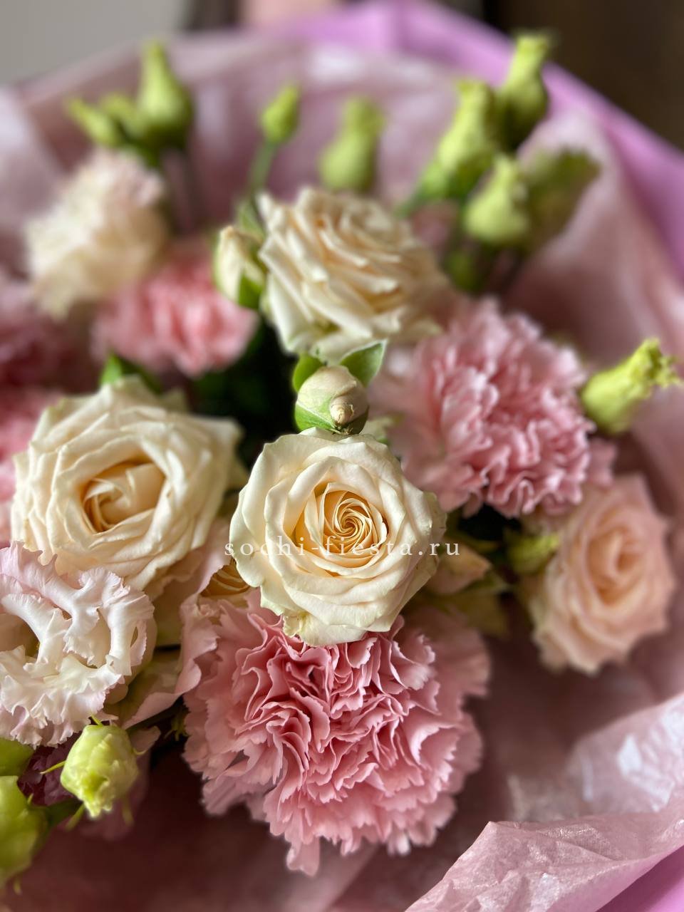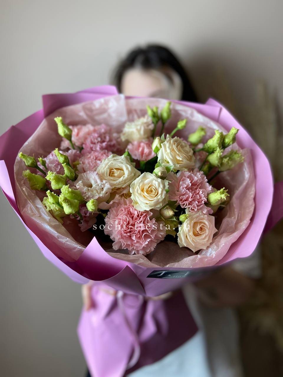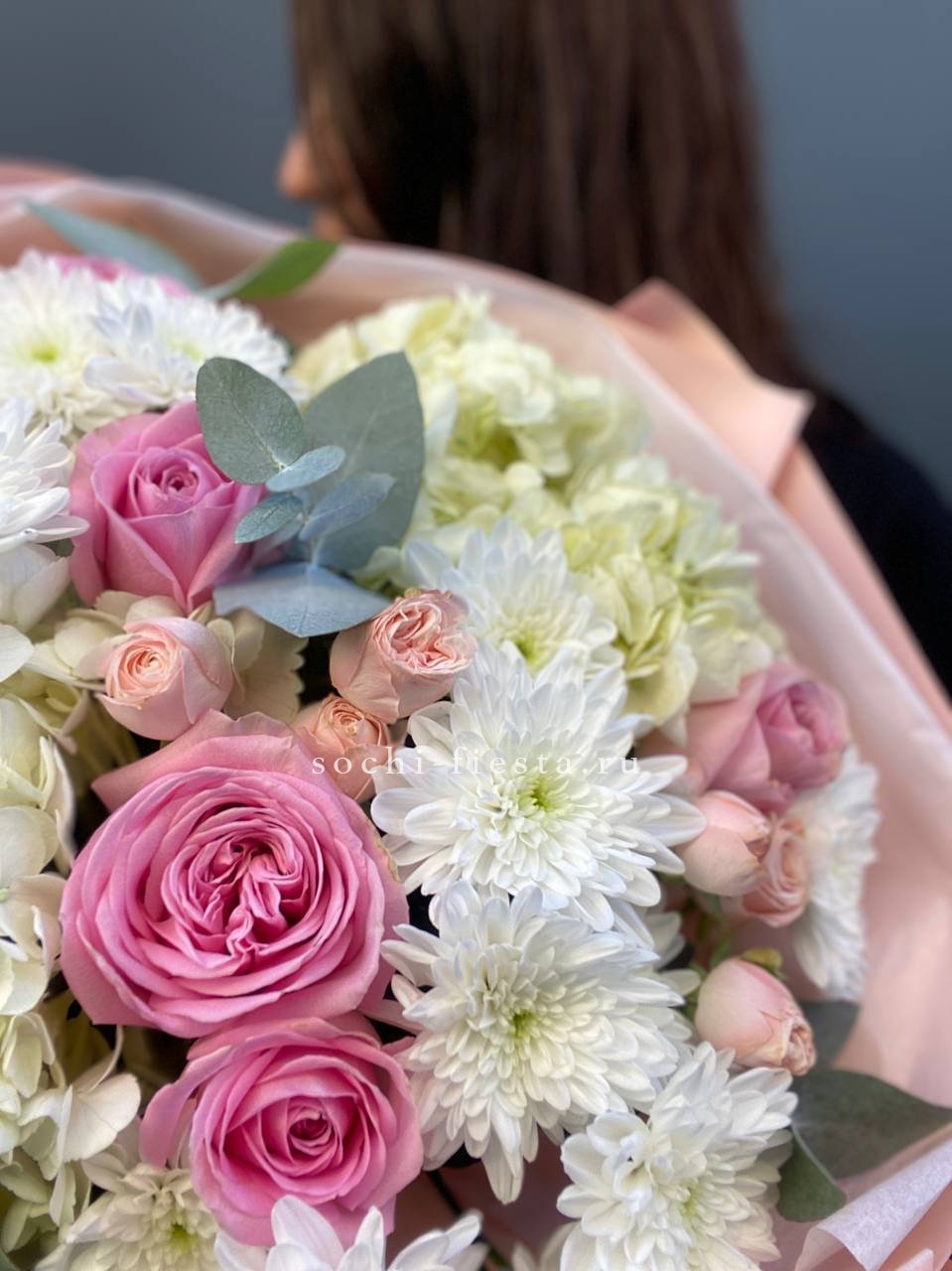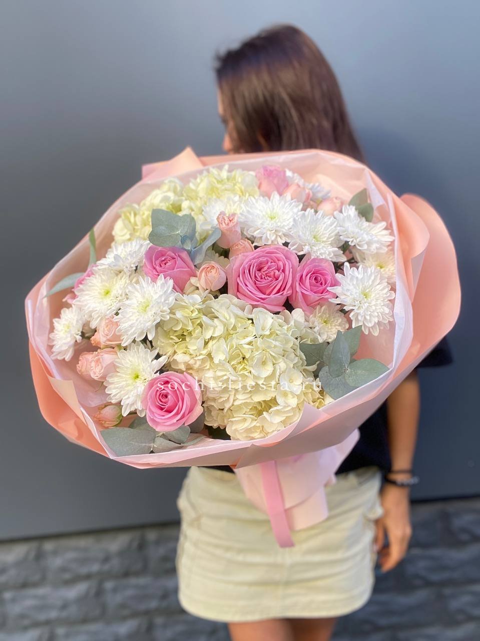 Диантусы и маттиола добавляют букету душистую лёгкость, а гортензия создаёт объёмную основу. Мисти баблс и эвкалипт рисуют воздушный контур вокруг розовых оттенков.