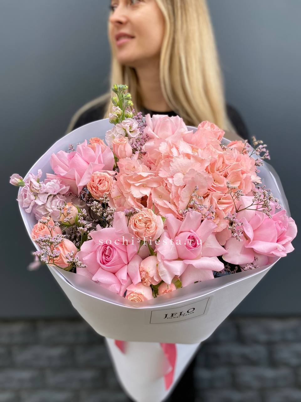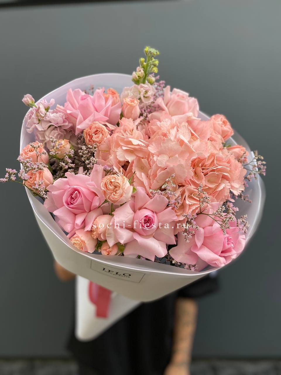 гортензия, диантус, кустовая пионовидная роза, эустома, вспомогательные цветы, эвкалипт, лента, дизайнерская упаковка.