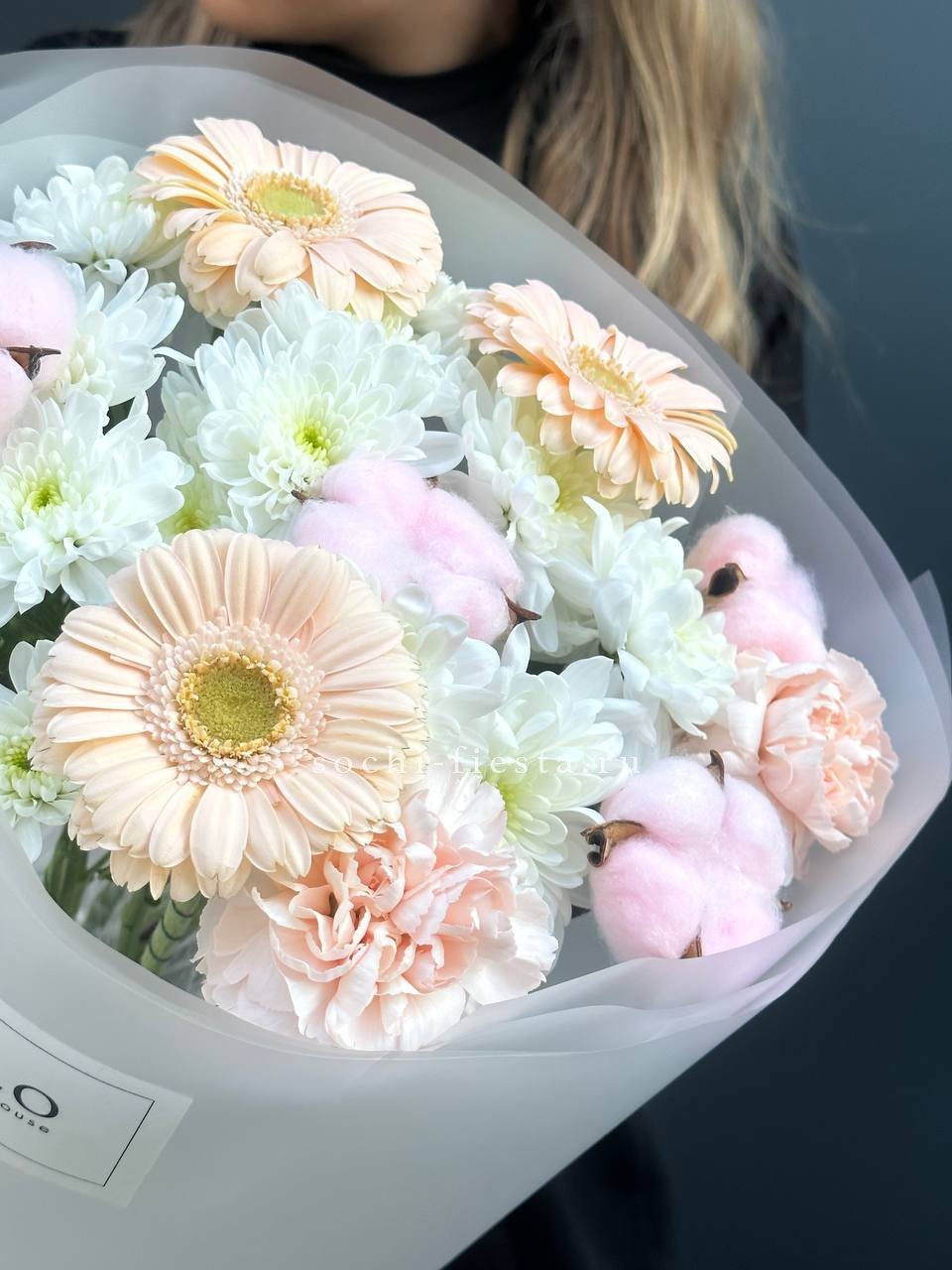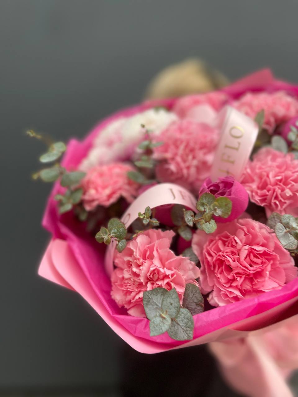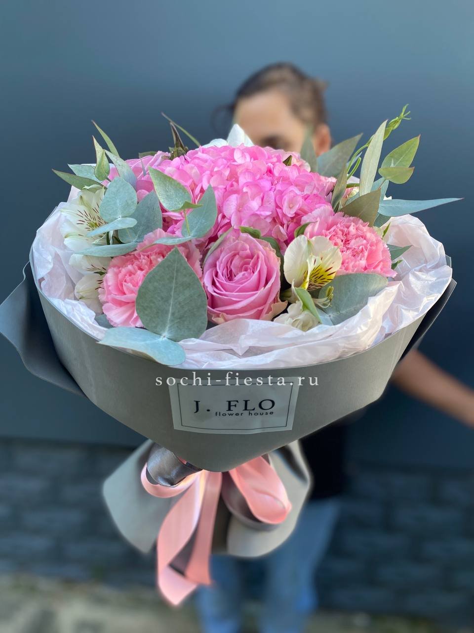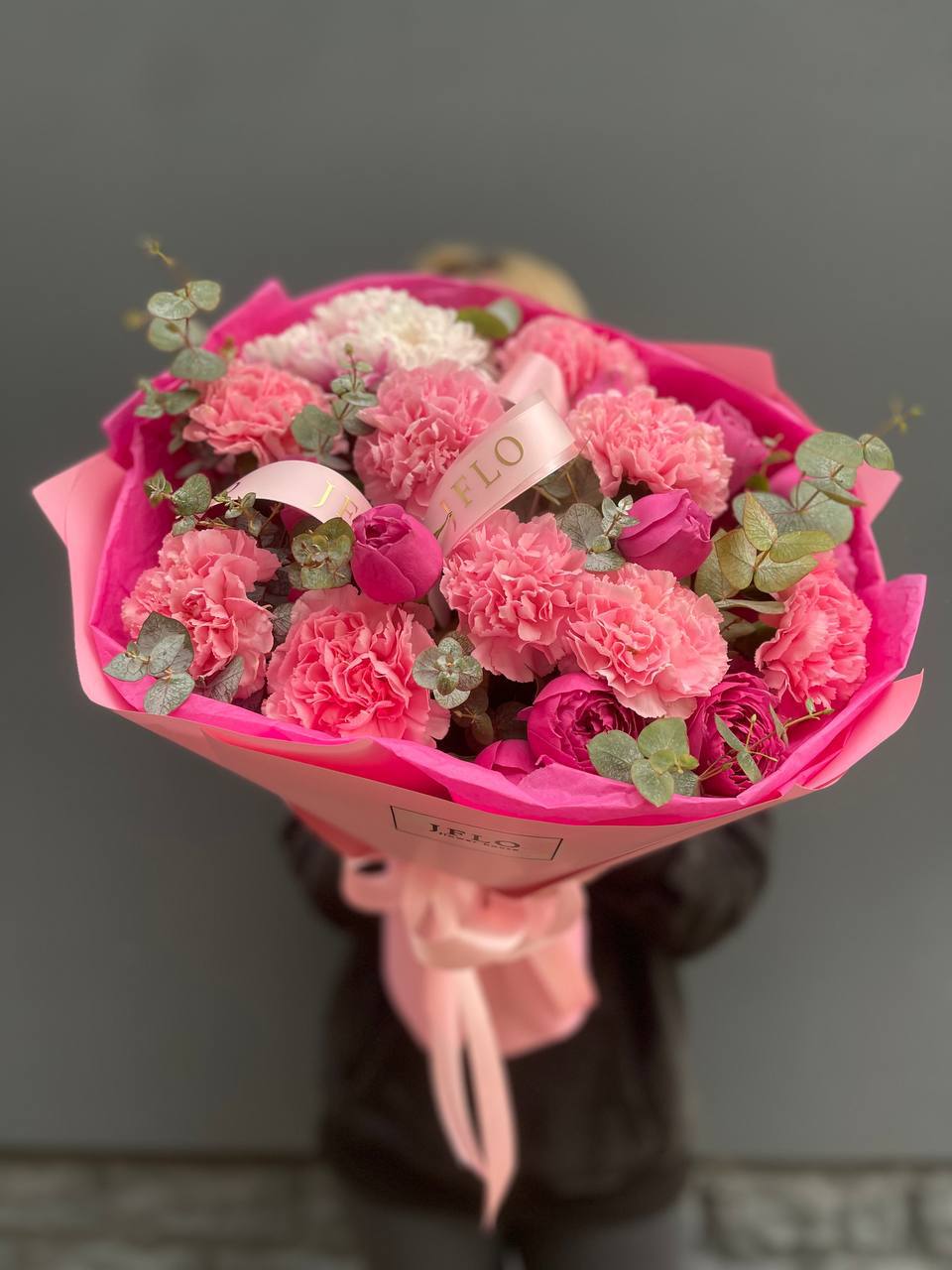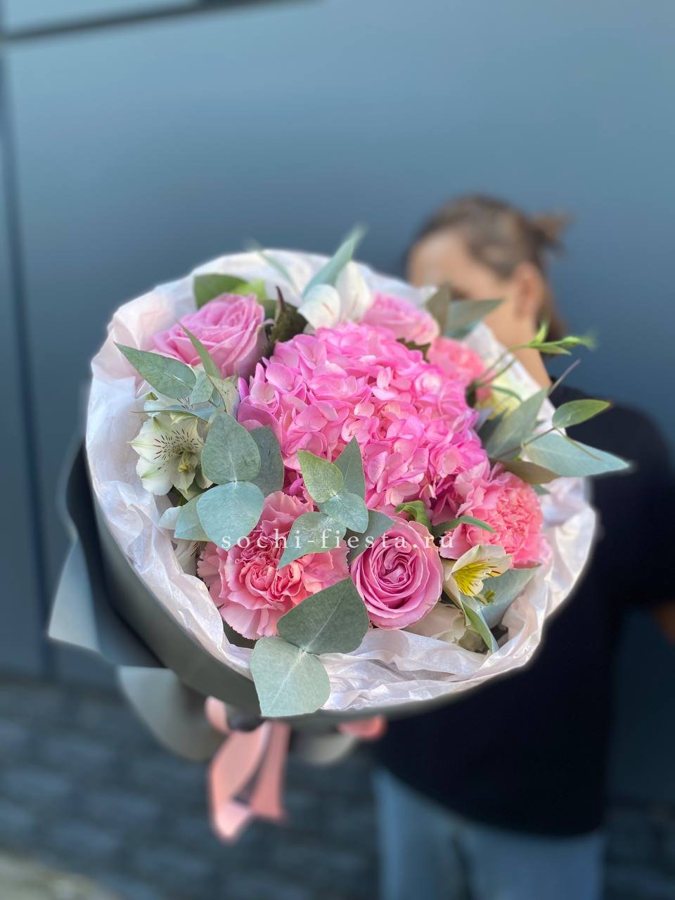 Пышная шапка из гортензии и пионовидных роз собрана с филигранной точностью. Диантус и эустома создают воздушные переходы между крупными соцветиями, а озотамнус добавляет графичные вертикали. Букет для тех, кто понимает язык авторской флористики.