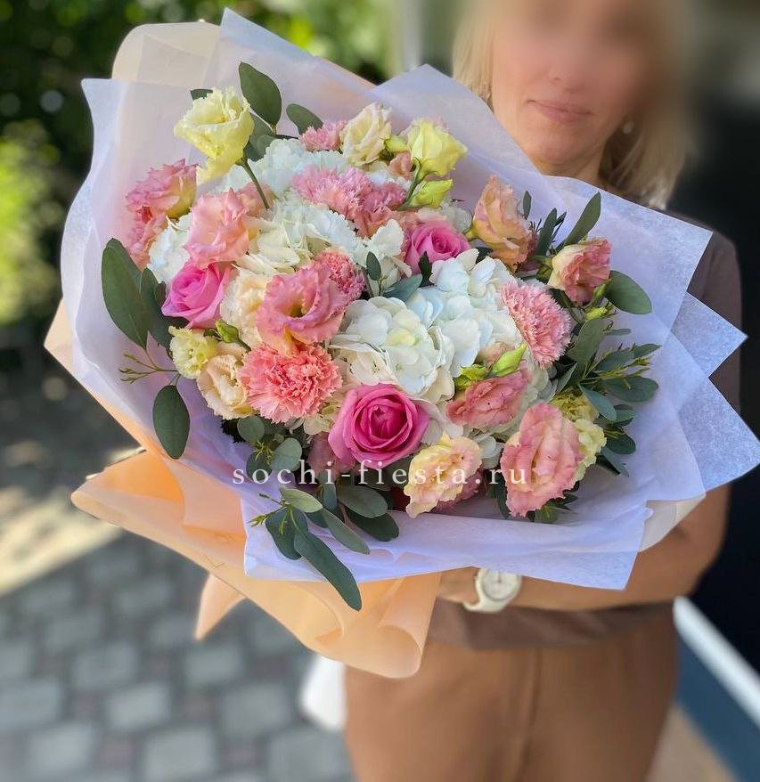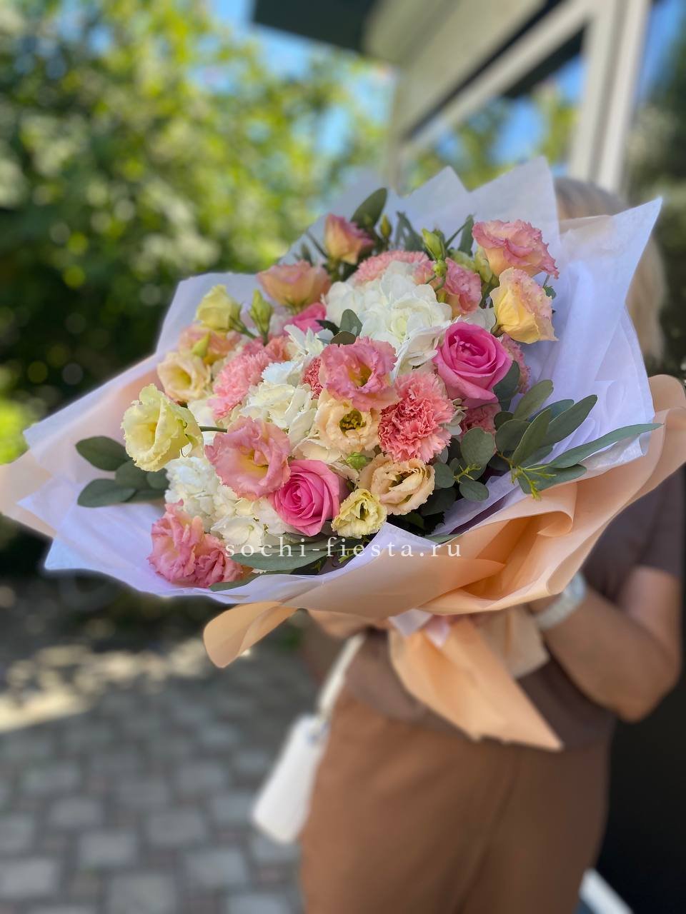 Кремовые розы окружены облаками гортензии, а эустома расставляет светлые акценты по краям. Букет держит форму и при этом выглядит объемно благодаря многослойной сборке.