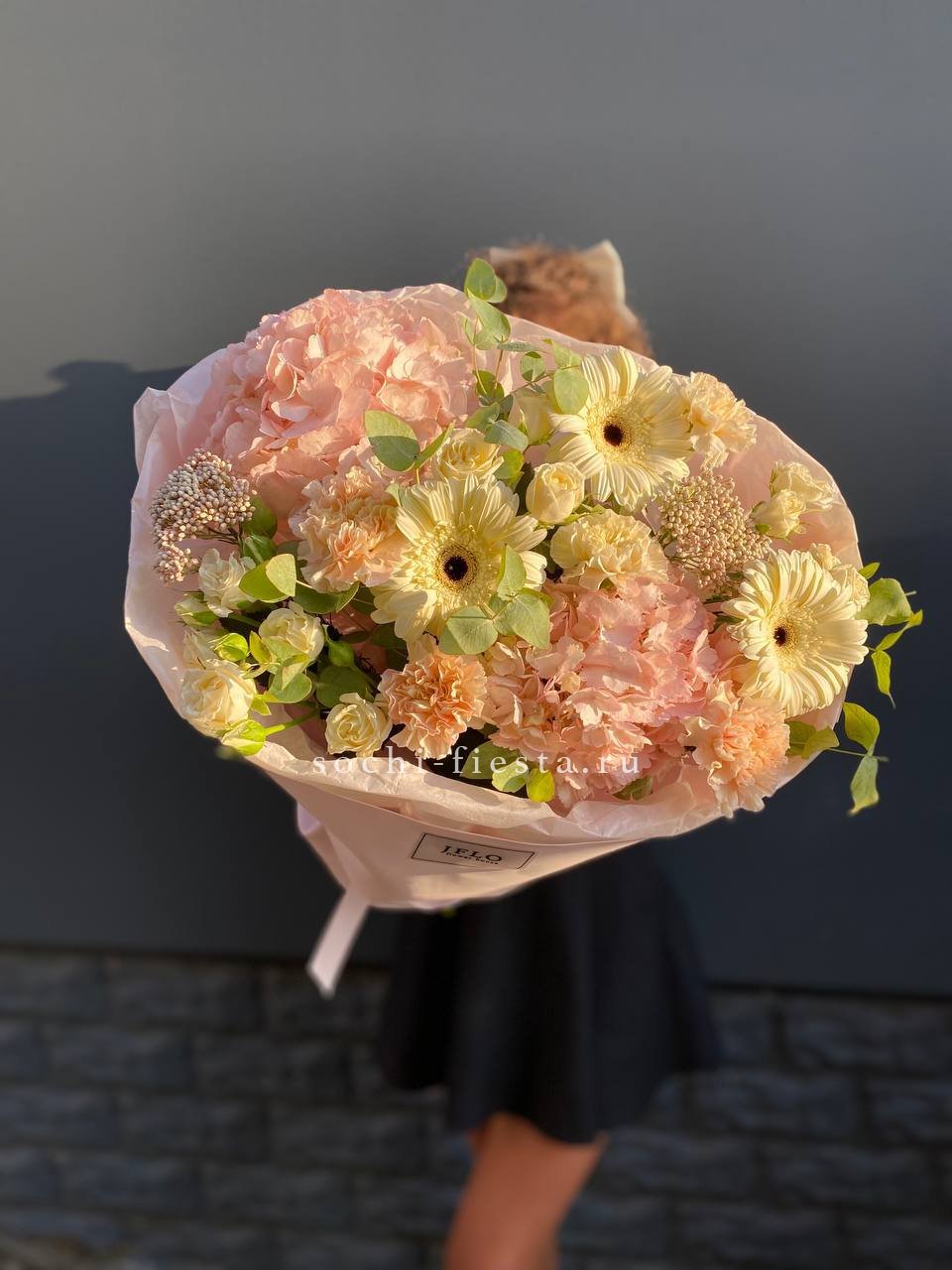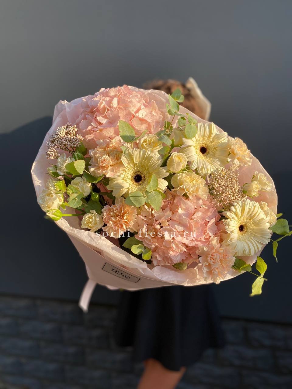 гортензия, гербера, диантус, эустома, свит ревиваль, кустовая роза, эвкалипт, лента, корейская пленка.