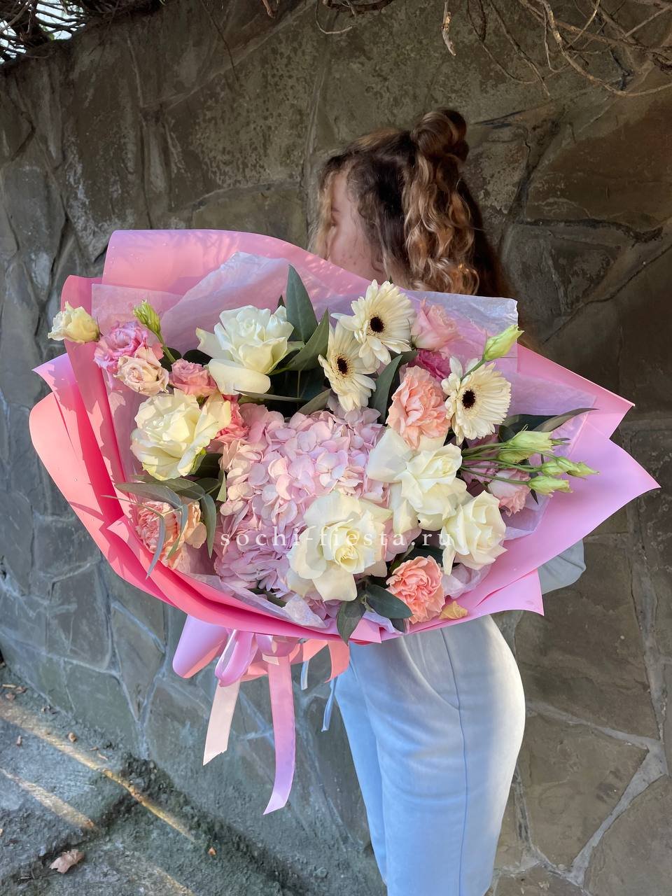 гортензия, эустома, кустовые розы, одноголовые розы, эвкалипт, вспомогательная зелень.