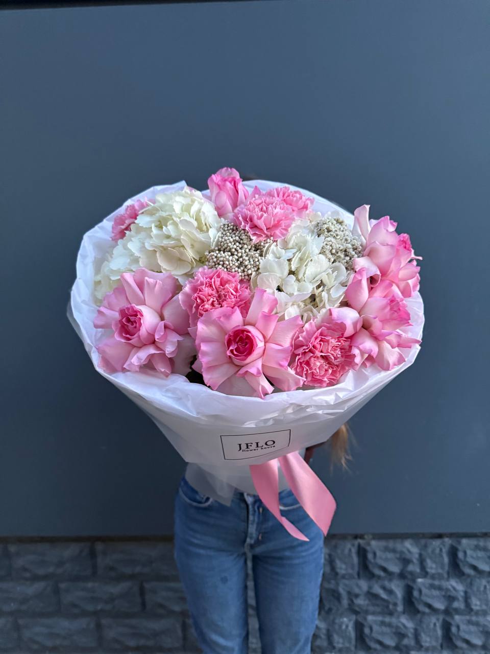 Компактная композиция с четким ритмом бутонов и легкой подачей. Гвоздики и розы собраны в аккуратную форму, удобную для размещения в любом пространстве.